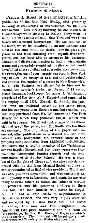 - The New York Times; April 18, 1883; Funeral for Francis S. Street
