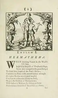 Hermathena emblem from Francis Tolson's book Hermathenæ, Or Moral Emblems, and Ethnick Tales (1740)