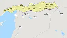 This treaty changed the Syria–Turkey border set by the 1920 Treaty of Sèvres to the benefit of Turkey, ceding it large areas of the Aleppo and Adana vilayets. From west to east, the cities and districts of Adana, Osmaniye, Marash, Aintab, Kilis, Urfa, Mardin, Nusaybin, and Jazirat ibn Umar (Cizre) were consequently ceded to Turkey. The border was to run from the Mediterranean Sea immediately south of Payas to Meidan Ekbis (which would remain in Syria), then bend towards the south-east, running between Marsova (Mersawa) in the Sharran district of Syria and Karnaba and Kilis in Turkey, to join the Baghdad Railway at Al-Rai From there it would follow the railway track to Nusaybin, with the border being on the Syrian side of the track, leaving the track in Turkish territory. From Nusaybin it would follow the old road to Jazirat ibn Umar, with the road being in Turkish territory, although both countries could use it.[3]