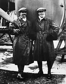 ![]() Frank Crossley Griffiths Broome (left) and Stanley Cockerell before their start in Vickers Vimy Commercial G-EAAV in 1920 to fly the Cope. | |