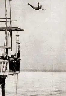 As well as public exhibition diving, Gadsby also performed diving in films, working in around 20 by 1929.[4] In 1927, he recalled while working on the 1926 silent film Forbidden Cargoes, he jumped into a net that was suspended over a cliff and it broke, but he managed to hold on and avoided dropping 300 feet (91 m). Gadsby reportedly had a previous close encounter with near death or injury, when he dived from the bridge of the RMS Berengaria and barely cleared a 24 feet (7.3 m) barge.[11] During his career, he performed in front of royalty and once entertained a crowd of over 90,000 at the Wembley Arena.[12]