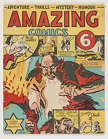 In July 1940 the Australian Government facing a US dollar shortage enforced a series of trade regulations and banned the importation of American comic material.[11] This ban created the opportunity for local publishers and artists to enter into the market, creating what has been described as "the richest period in Australian literary history; thousands of titles were produced, millions of copies sold, and dozens of authors found gainful employment".[12] Despite wartime paper restrictions and lack of experienced comic book artists a local industry soon developed, with new publishing companies producing indigenous comic books.[13] The first Frank Johnson Publication comic issued was Amazing, which was released in July 1941.[13][14] Since wartime regulations prohibited the publication of new periodicals, Frank Johnson Publications published one-shot comics. They continued to release a new comic each week, which in order were Star, Marvel, Magic, Thrilling, Super, Mighty, Master, Victory, Winner, Conquer, Hero, Hot Shot, Crash, Thunder, Terrific, Ace, Bullet, Corker, Startling, Modern and Monster. They continued to change the title week after week and when they had exhausted their supply of titles they re-used the old titles by adding the prefix, 'New' (i.e. New Crash, New Magic etc.).[14]
