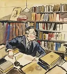 ![]() Frank C. Johnson at his desk (c. 1945), bookplate caricature (detail) by N. M. Sherlock ('Lock'). | |