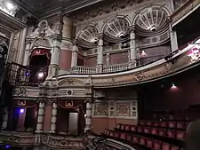 In addition to the Stockport theatre under Revill, Matcham received another commission from Elliston, this time to rebuild the Theatre Royal and Opera House, in Bolton, which had caught fire on 4 January 1888. Elliston's only requirement was for the building to be completed within a 20-week period, which Matcham honoured. The foundation stone was laid by the actor Henry Irving on 17 October, a month before its opening. Owing to the large numbers of people who died in a similar theatre fire in Exeter the previous year, Matcham improved the safety features, such as fireproofing the ceilings and walls; widening and straightening the staircases; using outwardly opening doors; installing hydrants on each floor; and hanging an automatic, fireproof curtain in the auditorium.[37] The interior was decorated in terracotta and gold tints and the seats covered in crimson upholstery.[38]