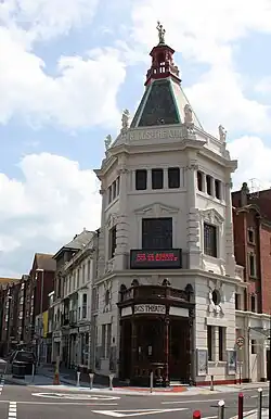 In 1910 the London Palladium was completed and opened on 26 December.[91] Designs for the Victoria Palace Theatre, for the variety magnate Alfred Butt, were already under way;[92] it opened the following November. During the design stage of the Palace, Matcham was working alongside Bertie Crewe for a new Hippodrome in Bristol which was to become Matcham's last major design.[91] The inter-war period was slow for theatrical architects and builders, mainly because of the introduction of cinema, and many of the theatres that had been designed in Matcham's office were now becoming picture houses.[93] Matcham & Co.'s projects had started to slow down by 1913; that year, the only theatrical venture was the Palace Theatre, in Leicester.[94]
