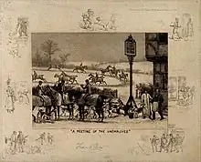 Although never a member of the Royal Academy, a total of 20 works by Paton were exhibited at their annual selling exhibition between the years 1878 and 1890.[22] Art dealer and collector Edward Ernest Leggatt published a series of Paton's etched Christmas cards annually from 1880 until Paton's death in 1909.[8] The cards were intended to be a cut above the average Christmas card and sold for half a guinea each.[8][9] Their format became formulaic over the years. A central subject reflecting the title of the print was usually complemented by a series of often humorous sketches around its border. A number of the prints would be sent from the printers to be signed in pencil by Paton.