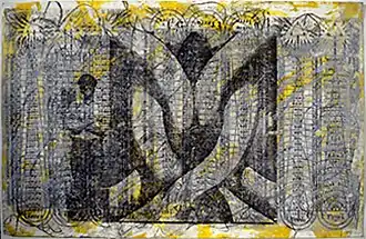 Piatek developed his second body of introverted, shamanistic work in the early 1970s, during a time of personal and artistic crisis; writers identify key its themes as death and rebirth, macrocosm and microcosm, myth and the collective unconscious.[6][47][21] He was initially inspired by a mural commission[43] that sought a landscape or tree image, leading him to experiment with sinuous, archetypal forms and emblematic hieroglyphs.[43][26] He pursued this direction privately in directly referential, symbolic drawings of spiders and trees, artifact-like sculpture, and carvings of snakes, stars, podlike sarcophagi and dead men in boats, covered in mud, twine and fabric.[9][6][47][21] The new work ended his relationship with Phyllis Kind Gallery, but culminated in an experimental installation at the alternative N.A.M.E. Gallery (1975), featuring a ritual-like arrangement alongside his established tube images.[48][31][49] Several reviews noted the interplay between the primal imagery and contemporary paintings, as well as the insights into Piatek's heretofore hidden process and inspirations.[49][31][48] Franz Schulze called the carvings persuasive, "fetishistic objects … sinister, private things, like effigies, full of atavistic implications;"[49] Derek Guthrie, however, found the primitive approach less convincing and over-intellectualized.[50] Piatek has continued to explore this more intimate work in various media and formats throughout his career.