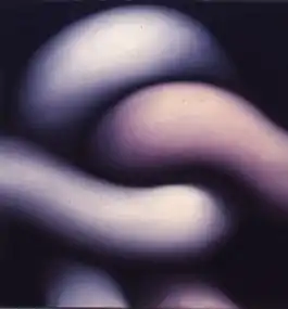 The tubular paintings became a trademark body of work that has explored wide-ranging variations for four decades. Piatek has painted them as twisting, patterned and symmetrical forms that emerge out of dark, packed, enigmatic space; reviewers such as Franz Schulze and Jane Allen described them as evoking close-up magnification of organic (bodies, limbs, phalluses, worms, intestines, trees), man-made (coils, ropes, chains, metal piping, knots, balloons), and symbolic forms.[41][42][43][36] They further characterize this work as featuring forceful drawing and rhythmical design that suggests coiled energy, subtle wet-on-wet modeling, cross-hatched brushwork and active surfaces, luminous color, and glowing ethereal light.[44][42][45][46][36][41] In the 1970s, Allen called them "portholes into a dimly lit fluorescent world of intertwining, undulating forms" that became a "fascinating exercise in the primary sensations of form";[41] Schulze described them as formally sober, seemingly abstract works that suggest visceral figurative associations, eroticism, fantasy and magic.[44][35][1]