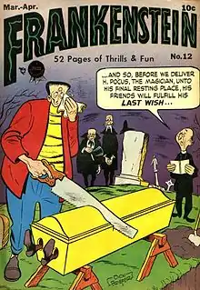 In Prize Comics #7 (cover-dated Dec. 1940), writer-artist Dick Briefer (using the pseudonym "Frank N. Stein" in the latter role) introduced the eight-page feature "New Adventures of Frankenstein", an updated version of 19th-century novelist Mary Shelley's much-adapted Frankenstein monster.[1] Considered by comics historians to be "America's first ongoing comic book series to fall squarely within the horror genre",[2][3] the feature, set in New York City circa 1930, starred a guttural, rampaging creature actually dubbed "Frankenstein" (unlike Shelley's nameless original monster).