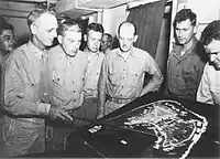 Col Franklin A. Hart (left), commander of the 24th Marines, briefs his staff on the operation plan for the invasion of Roi-Namur.