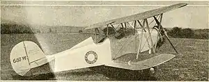 The Sport is a single bay, unequal span biplane. Its wings are built around twin spruce spars and, like the rest of the aircraft, fabric covered. Upper and lower wings have the same chord and outward-leaning, N-form interplane struts between their spars provide a wide interplane gap of about 50 in (1,300 mm). The upper wing is without dihedral but the lower, equipped with Frise ailerons, is set at 2°. Both wings are rectangular in plan out to rounded tips though the upper wing, held centrally over the fuselage on a cabane, has a semi-circular cut-out to increase the pilot's upwards field of view.[1]