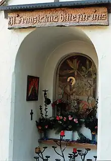 The Franziskus-Marterl is a chapel-shrine in the southeast of the unfinished Wackersdorf reprocessing plant (WAA) "Im Blaubeerwald" in Altenschwand (Bodenwöhr, Schwandorf (district), Bavaria). The WAA resistance marterl is dedicated to Francis of Assisi and is surrounded by several other protest monuments such as the Christian cross of Wackersdorf.[1] The "Franziskus-Marterl" is a stone reminder of the fight against the reprocessing plant (WAA). In 1986 the chapel was built on the site by Michael Meier, with the Wackersdorf Cross to the right.[2]
