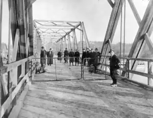 In 1918, a new Howe truss span was installed.[18] That year, the province ousted the whole South Vancouver council, appointing Francis Joseph Gillespie, as commissioner, to reorganize the municipal finances.[5] In December 1919, when Gillespie wanted the municipality to assume equal liability for the Evans' case, residents were angry.[19]