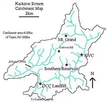 The stream drains the south eastern and eastern slopes of Flagstaff, Kaikorai Hill and the Balmacewen area, flows through Kaikorai Valley and Green Island and empties into Kaikorai Estuary. The water catchment area is 4,100 hectares (10,000 acres) and has about 15,000 residents.[1] There are two branches both sometimes known as 'Kaikorai Stream'.
