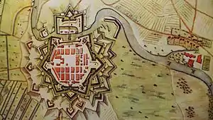 Situation of the abbey and the village of Fraulautern on the Flandernweg on the "Plan de Sarlouis et de la Situation", map around 1740 with the municipal fortification; in the east the village of Fraulautern with its abbey on the banks of the Saar (Stadtarchiv Saarlouis)