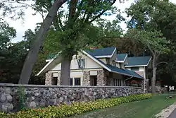 Fred Jones was a Chicago bachelor-businessman who had this estate on Lake Delavan built as a weekend cottage and a place to throw summer parties. Wright designed all the buildings, each different.[3] They were built while Wright's ideas were developing, and though the buildings fit nicely into their natural surroundings and emphasize the horizontal, they lack the flat roofs and lines that we now think of as Wright's Prairie Style.