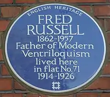 Fred Russell lived in Kenilworth Court in Putney, London, from 1914 to 1926. A blue plaque by the entrance of Kenilworth Court commemorates him.