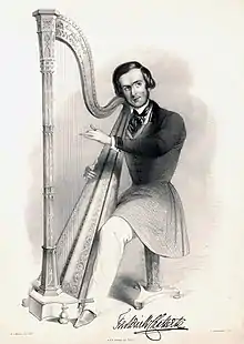 Frederick Chatterton was born at Portsmouth in 1812, the son of Mary née Callow (1779-1844) and John Chatterton (1778-), 'professor of music' who with his wife had eight sons and three daughters.[1] Earlier in life John Chatterton had inherited and spent a large fortune and not wanting the same thing to happen to his sons decided that at least three of them should become successful harpists. Two, the oldest and youngest - John Balsir Chatterton and Frederick Chatterton, followed their father's wishes. However, Edward Andrew Chatterton (c1809–1875), the second son, did not wish to follow his father's plan and instead became, at various times, a music publisher, a seller of musical instruments and a front of house manager at Sadler's Wells Theatre. Frederick Chatterton's older brother John Balsir Chatterton was harpist to Queen Victoria. Like his brother before him, Frederick came to London where he studied the harp under Bochsa and Labarre.[2] He was harpist to HRH the Duchess of Gloucester and Edinburgh and the Royal Courts of France and Belgium, having performed for Louis Philippe I, King of France in a Grand Concert in the Hall of the Marshalls of France in the Tuileries Palace.[3] In June 1842 at the Queen's Concerts Rooms in Hanover Square he gave a concert of his own compositions[3] and played in Doncaster in January 1856 where he played his own compositions - 'Highland Ballads', 'Welsh Bardic Illustrations', 'Morceau Fantastique' and 'Partant Pour Le Syrie'.[4]