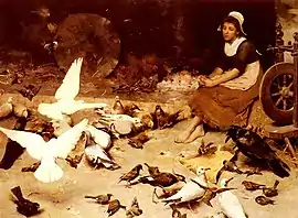 The Royal Cornwall Gazette, reviewing the 1886 exhibition by the Institute of Painters in Oil Colours, praised the picturesque quality of the houses and beach of his Cornish Village (1886), but criticised the inclusion of figures who lacked any raison d' être for being there.[8] His The Goose (1888) was exhibited at the Royal Academy's 1888 exhibition and was described by The Ipswich Journal as being clever and powerful,[9] while The Leeds Mercury called it humorous[10] and The Graphic 'broadly-comic' and 'eccentric in composition', even grotesque.[11]
