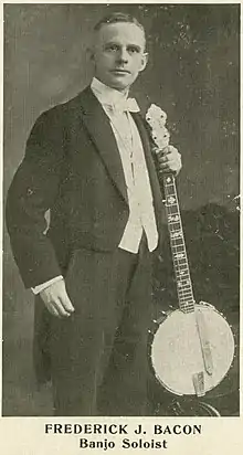 Frederick J. Bacon (1871-1948) was a late 19th to mid 20th century performer and recording artist on the five string banjo. He was also an inventor and entrepreneur, educator,[4] composer,[2] and designer and manufacturer of banjos.[5] At the height of his performance career he played the banjo nationally. Along with Fred Van Eps and Vess Ossman he was part of a group of banjoists labeled "virtuoso" in the newspapers.[6][5] He founded the F.J Bacon Co., possibly as early as 1902, after having invented a new resonator for open-back banjos.[7][4] It wasn't until 1908 that Bacon came up with Bacon Mfg. & Publishing Co. to sell his banjos and music compositions. During the Big Five tour Bacon became Bacon Mfg. Co in 1911 from Forestdale and incorporated Bacon Mfg. Co. in 1912 (dissolved in 1915). In 1918 from New London he called himself Bacon Banjo Mfg. Co. around 1918, and formally the Bacon Banjo Co. Inc in 1920 with E.O Winship and wives. In 1922 his company gained business experience in David L. Day, formerly of Vega. Together they produced Bacon and Day banjos (B.&D. on the headstock), some of which have been considered worthy of display in museums, as showpieces of artistic impulse from the Jazz Age. Frederick and his wife Cassie were proponents of the classic banjo style of playing banjo, in which the strings are plucked with the fingers, without picks.[8]