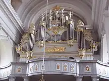 The church's first organ came from Hedvig Eleonora Church. When a decision was made to purchase a larger and more suitable organ, Lars Wahlberg received the contract to build an organ with 29 stops, 2 manuals and a pedal. When it was finished in 1764, he had inserted the 34 voices that are driven by six large bellows. Wahlberg's organ was replaced in 1905 by one built by Åkerman & Lund Orgelbyggeri in Stockholm; it was reconstructed in 1982–87 by Grönlunds Orgelbyggeri.