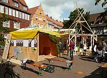 After the 30th anniversary of the eviction, the director Florian Fiedler, along with the Playhouse Hannover, initiated the theatre project Free Republic of Wendland -- Reactivated from 17 until 26 September 2010. About 50 students, especially from the Gesamtschule IGS Roderbruch, and 25 adults from the Ballhof Theatre in Hannover erected a hut village in Ballhof Square along the same lines of the original protest village. Several performances, including puppet acts by the Bread and Puppet Theater, as well as concerts, lectures and discussions on nuclear power took place. The festivities were kicked off with a performance by Ton Steine Scherben and concluded with a discussion led by Oskar Negt.[11] A lot of media attention was focused on the project after someone threw a pie at Green Party member Trittin during a panel discussion.[12] After nine days the hut village was dismantled. Two of the wooden huts were brought to the Wendland in order to provide an anti-nuclear activist shelter.[13]