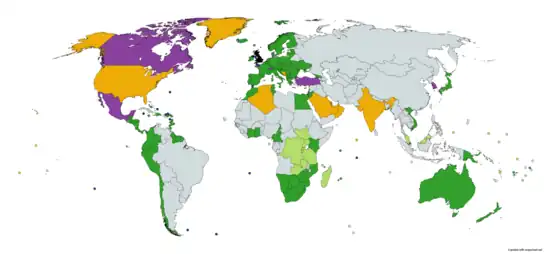 These treaties are divided into two types of free trade agreements: continuity agreements and 'new' agreements. Continuity agreements, also named rollover agreements, use of a mutatis mutandis concept in order to quickly replicate the existing EU agreements, only having to call out those minor areas of differentiation. Most continuity treaties were provisionally applied, or through a "bridging mechanism", thus continuity was achieved.[1] Trade agreements negotiated after Brexit are termed 'new', or enhanced agreements, these agreements have been negotiated from scratch or have been renegotiated to enhance the deal since Brexit.[2][3]