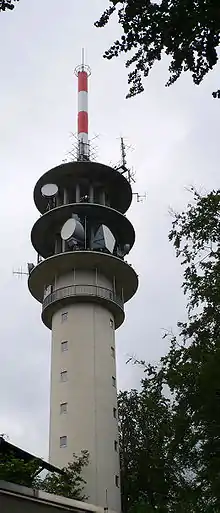 Fremersberg Tower (German: Fremersbergturm) is an 83-metre-tall (272 ft) telecommunication tower built of reinforced concrete with an observation deck 30 metres above ground. There is a small restaurant located next to the tower. Fremersberg Tower, which was built in 1961 is situated on 525-metre-high (1,722 ft) Fremersberg near Baden-Baden at 8°12'8" E and 48°45'10" N.