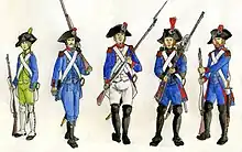 French soldiers from the 1798–1801 Egyptian campaign (left to right, clockwise): line infantry officer, line infantryman, line drummer, light infantryman.