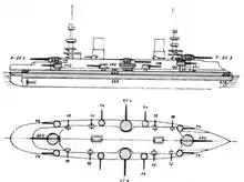 The basic design for the ships was based on the previous battleship Brennus, but instead of mounting the main battery all on the centerline, the ships used the lozenge arrangement of the earlier vessel Magenta, which moved two of the main battery guns to single turrets on the wings.[2] Although the navy had stipulated that displacement could be up to 14,000 tons, political considerations, namely parliamentary objections to increases in naval expenditures, led the designers to limit displacement to around 12,000 tonnes (12,000 long tons; 13,000 short tons). Five naval architects submitted proposals to the competition; the design for Masséna was prepared by Louis de Bussy, the Inspector General of Naval Construction, who had previously designed the ironclad battleship Redoutable and the armoured cruiser Dupuy de Lôme. Though the program called for four ships to be built in the first year, five were ultimately ordered: Masséna, Charles Martel, Jauréguiberry, Carnot, and Bouvet.[3]