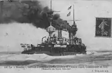 During her period in the Reserve Division, Masséna was manned with a reduced crew that would be completed with naval reservists if the vessel needed to be activated for maneuvers or to take the place of a front-line battleship during a refit.[18] Masséna was present for the 1907 fleet maneuvers, which again saw the Northern and Mediterranean Squadrons unite for large-scale operations held off the coast of French Morocco and in the western Mediterranean. The exercises consisted of three phases and began on 2 July and concluded on 30 July.[20] On 13 January 1908, she joined the battleships République, Patrie, Gaulois, Charlemagne, Saint Louis, and Jauréguiberry for a cruise in the Mediterranean, first to Golfe-Juan and then to Villefranche-sur-Mer, where the squadron stayed for a month. Masséna hosted President Armand Fallières during a major fleet review held off Toulon on 4 September 1911. On 16 October 1912, Masséna, Gaulois, Saint Louis, Carnot, Bouvet, and Jauréguiberry were activated for training duties as the 3rd Squadron of the Mediterranean Squadron; in July 1913, they were joined by Charlemagne. The squadron was dissolved on 11 November and Masséna returned to the reserve.[21]