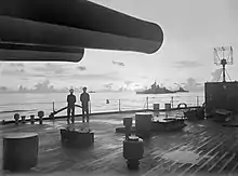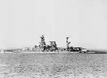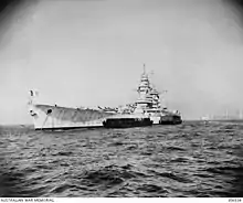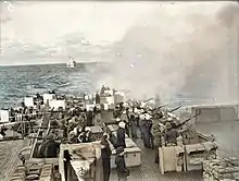 Richelieu returned fire at 09:40, but her No. 7 gun was destroyed by a shell that detonated in the barrel and the No. 8 gun was also badly damaged. This was first traced to the use of the remanufactured propellant from Strasbourg, but a later inquiry in 1941 found the explosions were caused by a flaw in the design of the shell base.[25][26] Guns 5 and 6 remained in action but failed to score any hits. At 09:57, one of Richelieu's secondary guns hit Barham. In return, the British ships inflicted only minor splinter damage before breaking off at 10:07. The French had counted some 160 shells landing near the ship. The French laid smoke screens to obscure Richelieu before the British returned to the action at 12:53, initially targeting a destroyer before bombarding the port for the next 30 minutes. Richelieu was not hit and, from 12:56, she fired guns 5 and 6 at the British cruisers, quickly straddling one of them and convincing them to disengage. She fired four 380 mm shells at Barham at 13:11–13:12 but failed to score a hit, though both British battleships were hit several times by coastal batteries. After disengaging for the day, de Gaulle decided to abandon the operation, but Cunningham convinced him to allow a final attempt the next morning. In the meantime, Marzin decided to transfer the crews from turret 2 to turret 1, which also required moving the shells and propellant between magazines.[27][28]