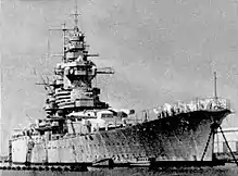 She was armed with eight 380 mm/45 Modèle (Mle) 1935 guns arranged in two quadruple gun turrets,[lower-alpha 1] both of which were placed in a superfiring pair forward of the superstructure. Her secondary armament consisted of nine 152 mm (6 in) /55 Mle 1930 guns mounted in three triple turrets, arranged on the rear superstructure. Heavy anti-aircraft (AA) defense consisted of twelve 100 mm (3.9 in) /45 Mle 1930 anti-aircraft guns in twin turrets. Close range anti-aircraft defense was provided by a battery of eight 37 mm (1.5 in) guns in twin mounts and twenty 13.2 mm (0.52 in) machine guns in four quadruple and two twin mounts. The ship's belt armor was 330 mm (13 in) thick amidships, and the main battery turrets were protected by 430 mm (17 in) of armor plate on the faces. The main armored deck was 170 mm (6.7 in) thick, and the conning tower had 340 mm (13 in) thick sides.[2][4]