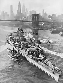 Richelieu arrives in New York with her damaged turret. The uppermost fire control director on the fore tower had to be dismantled for her to pass under the Brooklyn Bridge to the New York Navy Yard