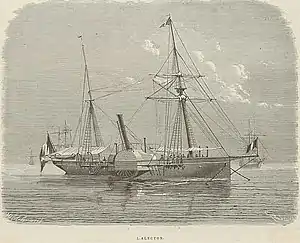 The Alecton, named after Alecto, one of the three Furies, was a paddle wheeler (aviso à roues de deuxième classe, type Étoile modifié) laid down in 1859 at the La Seyne shipyard of the Société des Forges et Chantiers de la Mediterranée and launched in 1861.[3][4] She had a length of 50.9 metres and a beam of 12.1 metres. Alecton was powered by both a 120 hp steam engine and sails on two masts, had a crew of sixty-six and an armament of two light cannons. Her displacement was 570 tonnes. Alecton was first stationed at French Guiana and from 1868 onwards at Guadeloupe. She was decommissioned on 10 August 1883 and scrapped in 1884 at Lorient.[4][3]