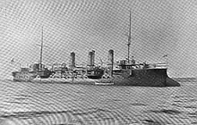 She was then transferred to Port Etienne to supply the French colony with water in May 1919.[6] For budgetary reasons, the Ministry of the Navy decommissioned the cruiser and sold her to the French fishery "Société Industrielle de la Grande Pêche" in 1921.[17][18] She was used as a floating warehouse and as a cistern for drinking water brought once a month from the Canary Islands.[19] She was ultimately sunk in 1926 and became the first ship to be abandoned in the bay of Nouadhibou, Mauritania.[20][21][22][23]