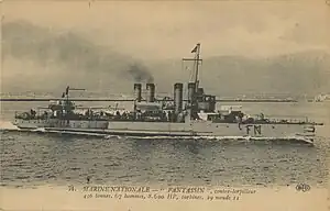When the First World War began in August 1914, Vice-Admiral (Vice-amiral) Augustin Boué de Lapeyrère, commander of the 1st Naval Army, was tasked to prevent the Austro-Hungarian Navy from leaving the Adriatic Sea and breaking their blockade of Antivari (now known as Bar). His first step was to lead a sweep of the southern Adriatic and clear the approaches to Antivari. During the preliminary stages of the Battle of Antivari on 16 August, the 1st, 4th and 5th Destroyer Flotillas were tasked to escort the core of the 1st Naval Army while the 2nd, 3rd and 6th Flotillas escorted the armored cruisers of the 2nd Light Squadron (2e escadre légère) and two British cruisers. After reuniting both groups and spotting the Austro-Hungarian protected cruiser SMS Zenta and the destroyer SMS Ulan, the French destroyers played no role in sinking the cruiser, although the 4th Flotilla was sent on an unsuccessful pursuit of Ulan.[7] The following day, Fantassin collided with her sister ship Cavalier.[2]