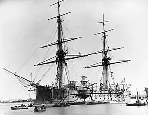 On 8 June 1887, Vauban was assigned to the Naval Division of the Levant, where she served for the next five years. She was based in Piraeus, Greece, where she was the station ship. During this period, the unit was enlarged and renamed the Eastern Mediterranean and Levant Squadron,[5] and Vauban frequently returned home for training exercises. In 1890, Vauban served in the 3rd Division of the Mediterranean Squadron as the flagship of Rear Admiral O'Neill, along with her sister ship Duguesclin and the ironclad Bayard. She took part in the annual fleet maneuvers that year in company with her division-mates and six other ironclads, along with numerous smaller craft. Vauban served as part of the simulated enemy force during the maneuvers, which lasted from 30 June to 6 July.[9] During the 1890 fleet maneuvers, the ship was transferred to the 4th Division of the 2nd Squadron of the Mediterranean Fleet, along with Duguesclin and Bayard. The ships concentrated off Oran, French Algeria on 22 June and then proceeded to Brest, France, arriving there on 2 July for combined operations with the ships of the Northern Squadron. The exercises began four days later and concluded on 25 July, after which Amiral Duperré and the rest of the Mediterranean Fleet returned to Toulon. During the maneuvers, a number of French ships suffered machinery problems, including Vauban, which had ball bearings in her propulsion system become overheated, forcing her to temporarily withdraw from operations.[10]