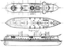The Vauban class of barbette ships was designed in the late 1870s as part of a naval construction program that began under the post-Franco-Prussian War fleet plan of 1872. At the time, the French Navy categorized its capital ships as high-seas ships for the main fleet, station ironclads for use in the French colonial empire, and smaller coastal defense ships. The Vauban class was intended to serve in the second role, and they were based on the high-seas ironclad Amiral Duperré, albeit a scaled-down version.[1] Unlike their wooden-hulled predecessors of the Bayard class, Vauban and Duguesclin adopted composite steel and iron construction for their hulls.[2]
