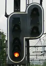 The semaphore orders a temporary halt, usually because the block it protects is engaged by another train. As a permissive signal, the semaphore allows the driver to proceed at low speed. The plate defines the level of permissiveness which determines under which conditions the driver may proceed. There may also be a small white light (lit œilleton) to confirm the permissiveness when required. A driver passing a red light must advance at a speed within sighting distance until they reach the next permissive signal. |