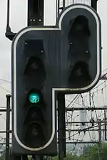 - a 'block free' signal (green), meaning that the next block is clear or, in the case of a distant signal, that the next signal is also green;