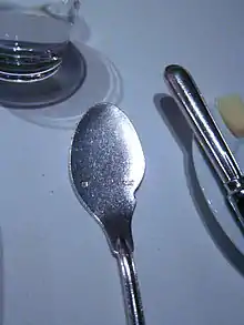 A French sauce spoon or saucier spoon is a spoon that is typically the size and shape of a dessert spoon, but with a flattened bowl that has a thinner edge and a small notch on one side. As the name suggests, a French sauce spoon is used to eat the sauce accompanying a dish. Such a spoon may be referred to simply as a sauce spoon, but this can also refer to a spoon used to serve sauce.