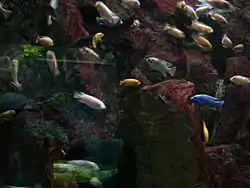 An African cichlid aquarium commonly consists of Lake Tanganyika or Lake Malawi cichlid varieties, and generally requires a large number of rocks combined with a substrate of fine gravel or sand. The rocky environment should provide numerous caves and hiding places. Because cichlids, like goldfish, disturb the substrate by digging, plastic plants should be used as a substitute for live plants. However, real plants like Vallisneria or Anubias can be tried in a cichlid tank.[2]