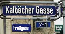 Freßgass was originally an unofficial name, adopted around 1900 by its local population, for the streets Kalbächer Gasse and Große Bockenheimer Straße, because of their many high-end food shops, bakeries and butcheries, making it the most famous food shopping street serving the bourgeoisie of the Westend. Today the Freßgass is famous as the street where the bankers from the Bankenviertel meet for lunch; banker Alex Bergen notes that "around 90% of the meeting and greeting between M&A bankers happens in one street – the Fressgass."[3] In 1977, the name Freßgass became an official name for the streets Kalbächer Gasse and Große Bockenheimer Straße.