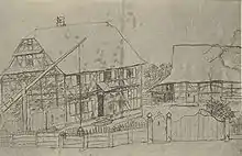 The young Johann Wolfgang Goethe from Frankfurt am Main visited the hospitable parsonage, like several other young people, while studying law in Strasbourg. He first reached Sessenheim in October 1770 and met Friederike there, for the first time, the same month,[1][2] when he was exploring the region on horseback with an Alsatian friend, the medical student Friedrich Leopold Weyland (1750-1785[3]). His depiction of Friederike, whom he liked most of the parson's three daughters, contains a lot of fantastical additions, but shows the situation vividly and lovingly, mentioning Friederike's slenderness and lightness, her way of walking "as if she did not have to bear any weight", the impression that her neck was almost too delicate to bear her dainty head with its huge plaits, the very direct glance of her serene blue eyes, and her nice snub-nose "searching as freely in the air as if there could be no sorrow in the world".[4] The description is counted a literary masterwork that shows an enchanting scene with the help of modest colors.[5]