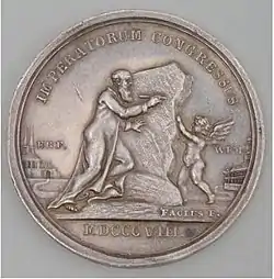 Commemorative medal for the Congress of Erfurt in 1808. Reverse: An allegorical representation of Time, inscribing the history of the meeting on a rock; dictated to him by a winged Genius.