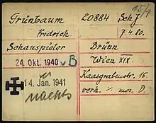 Grünbaum and his wife, Lilly, attempted to flee to Czechoslovakia, but were caught. Initially he was interned in Vienna as a political undesirable, rather than a Jew; on 24 May 1938, together with Morgan, Fritz Löhner-Beda and Hermann Leopoldi, he was deported to Dachau concentration camp. He was transported from there to Buchenwald on 23 September 1938, and on 4 October 1940 back to Dachau. He continued to quip, for example musing on the effectiveness of starvation as a cure for diabetes and in response to a guard refusing him soap, saying that those who did not have enough money for soap had no business running a concentration camp.[2][7] After a final performance on New Year's Eve for his fellow inmates, he died on 14 January 1941.[2]