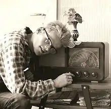 ![]() Moen "listens" to the radio (1959). He could hear and feel high bass sounds. | |