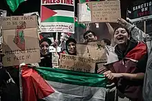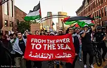 The slogan has been used widely in pro-Palestinian protest movements.[67] It has often been chanted at pro-Palestinian demonstrations, usually followed or preceded by the phrase "Palestine will be free" (the phrase rhymes in English, not Arabic).[68][69][70][71] Interpretations differ amongst supporters of the slogan. In a survey conducted by the Arab World for Research and Development on November 14, 74.7% Palestinians agreed that they support a single Palestinian state "from the river to the sea", while only 5.4% of respondents supported a "one-state for two peoples" solution.[72][73][74]
