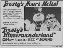 Frosty's Winter Wonderland is a 1976 animated Christmas television special and a standalone sequel to the 1969 special Frosty the Snowman, produced by Rankin/Bass Productions[1] and animated by Topcraft. It is the second television special featuring the character Frosty the Snowman. It returns writer Romeo Muller, character designer Paul Coker, Jr., music composer Maury Laws and actor Jackie Vernon as the voice of Frosty, while Andy Griffith stars as the narrator (replacing Jimmy Durante, who had been incapacitated by a stroke three years prior and retired from acting)[2] with the rest of the cast consisting of Shelley Winters, Dennis Day, and Paul Frees. The special premiered on ABC on December 2, 1976.[3]